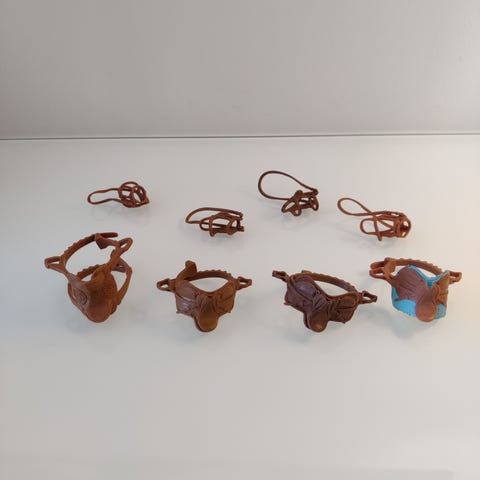 Schleich satula ja suitset 16-22€/kpl ponille tai pienelle hevoselle. Yleisesti siistit ja toimivat. Retkisatulassa kulumaa.
