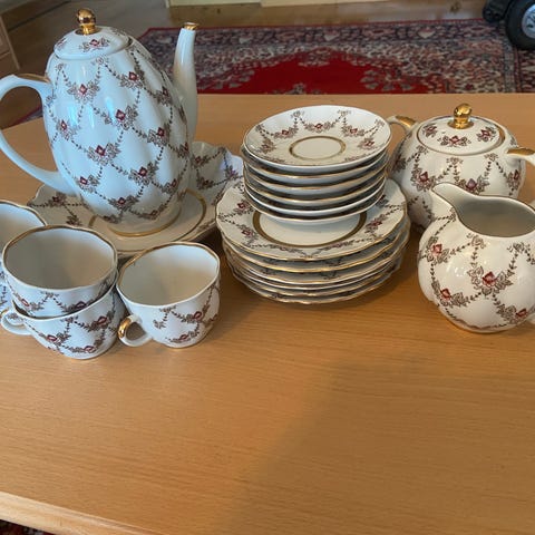Kuvanmukainen kuuden hengen kahviastiasto. Nimi saattaa olla Ruusu talvipuutarhassa. Kaikki osat ovat ehjiä, eikä mielestäni kultauksessa ole kulumia. Epäilen, että astiasto ei ole ollut käytössä montaakaan kertaa. En lähetä, joten noutaessa ostaja voi tarkistaa itse kunnon.