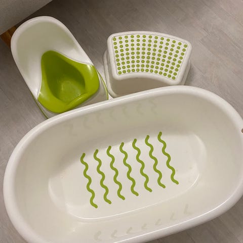 Muovinen ankka jossa voi säilyttää esim kylpyleluja, ankan päällä voi istua.