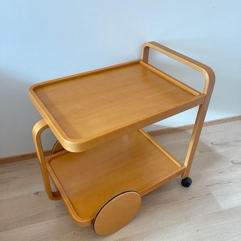 Tarjoiluvaunu/apupöytä. Lakattua mäntyä. Syvyys 48cm, leveys 84cm ja korkeus 75cm. Mitat kahvoineen ja koristeineen. Raasepori. Fiskars. Kulkeutuu omien menojen mukana lähialueille.