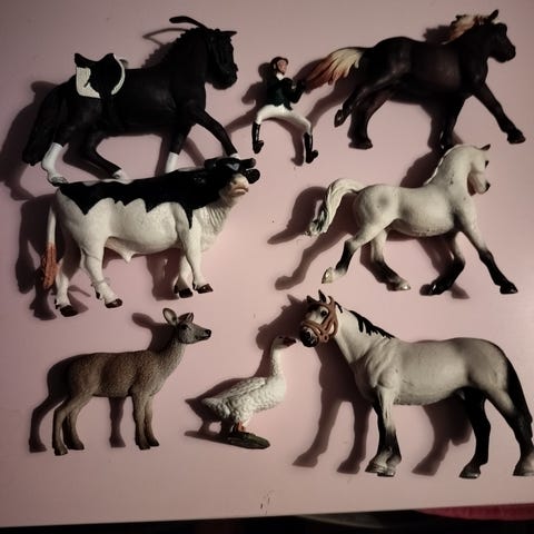 Viimeisenä on kaksi kopiota Schleich hahmoista, eivät siis ole aitoja, mutta saman kokoisia. Molemmat saa hintaan 1€.