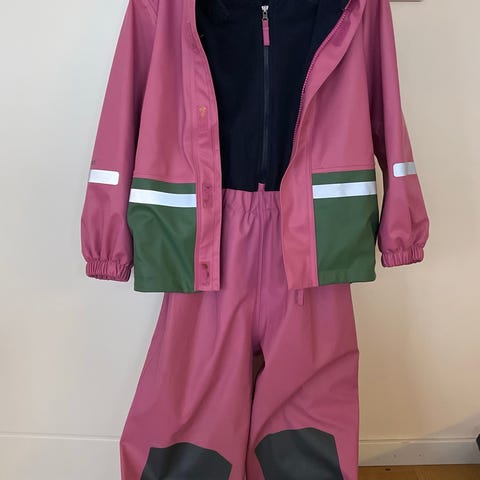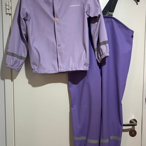 Didriksons Boardman vuorellinen sadeasu (takki ja housut) koko 130. Aivan älyttömän hyvä asu näille märille ja kylmille keleille. Pitää kuivana ja lämpimänä. Fleecevuori. Puntissa vuori ei mene alas asti, eli ei ime vettä vuoriin. Hyvät heijastimet. Todella hyväkuntoinen asu. Myynnissä myös muualla.