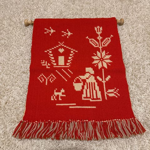 Kirkko täkänä. Korkeus hapsuineen 64cm, leveys 40cmm