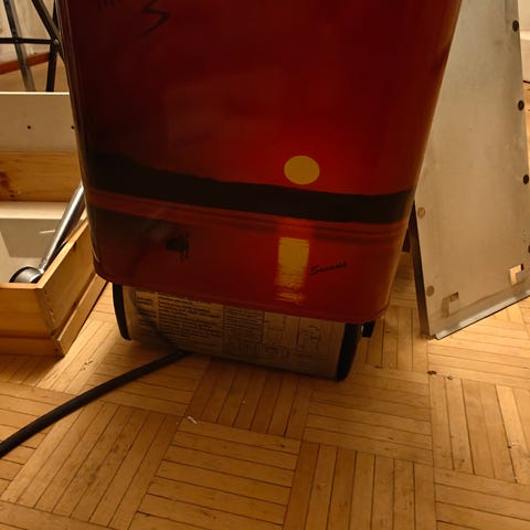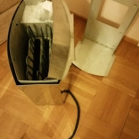 6kW sähkökiuas Helo. Ikää on reilu 20v ja vastukset on hiukan taipuneita, mutta kaikin puolin toimiva peli.