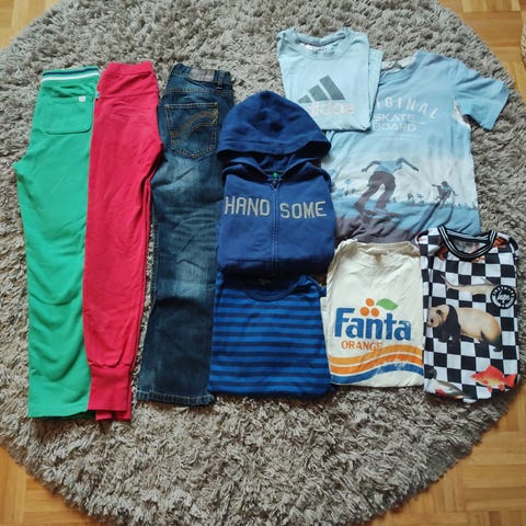 4 collaria (Me&I, Adidas, Lindex, Adidas x Marimekko), 3 t-paitaa (Levi', Vans, Jack&Jones), fleecepaita (Odlo), yöpaita, housut (Lindex) ja hame. Pääasiassa kokoa 140, satunnainen 146/152 lisäksi. Näitä kaikkia käytetty samaan aikaa koossa 140-152😅