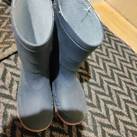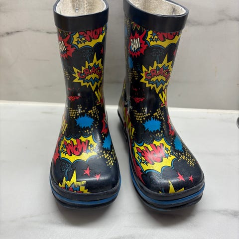 Poikien kumisaappaat, joissa kuvia eri kulkuneuvoista.