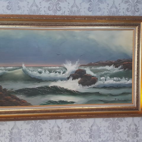 Osmo A.Mäkelän merenranta-aiheinen taulu vuodelta 1984. Koko 710x570mm kehyksineen ja kehyksen leveys 85mm. Taulu on hyvä kuntoinen.