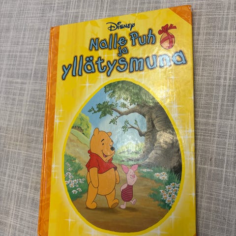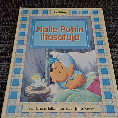 Nalle Puhin pieniä iltasatuja kirja. Muuten kunnoltaan oikein siisti, mutta kulmissa hieman kulumaa ja keskellä ylhäällä pieni pala pois.