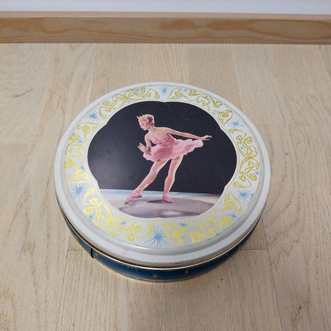 Ihana peltirasia, jonka kannessa on brunetti ballerina. Rasiassa on jonkin verran patinaa.