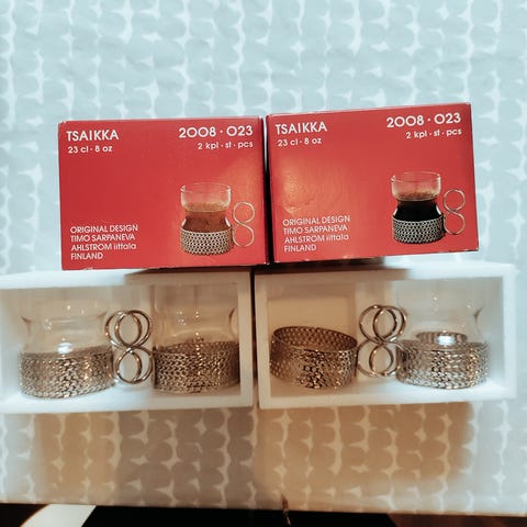 Iittala sininen lasinen teekuppisetti, jossa on metalliset pidikkeet. Soveltuvat kuumien juomien tarjoiluun. Kupit ovat sinisen sävyisiä ja niiden metalliset pidikkeet helpottavat käsittelyä kuumana.