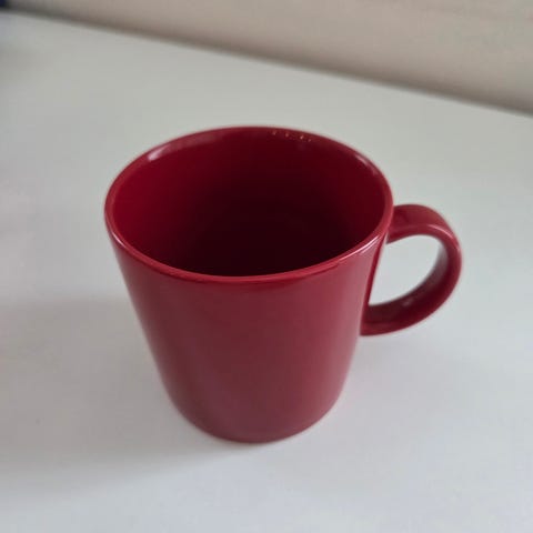 Iittala Teema -muki, punainen. Posliininen kahvimuki, joka sopii arkeen ja juhlaan. Toimitus Tikkurilan, Haagan ja Töölön alueelle.