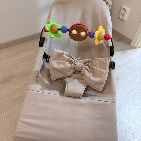 BabyBjörn sitteri lelukaarella. Siisti ja hyväkuntoinen. Niskan kohdalle kankaaseen ruokalapun tarra raapinut pieniä jälkiä, näkyy kuvassa. Sisällä vierailee koira.