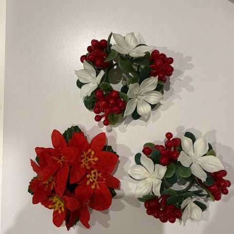 Kaunis punainen kynttilämansetti pöytäkynttilälle tai muuhun joulusomistukseen. Mansetin kokonaishalkaisija noin 20cm, mutta oksia voi taitella mieleisekseen.
