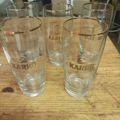 6 Karhun tuoppia kangaskassissa johon mahtuu mukaan muutakin evästä. Tuopit ovat ehjiä, etiketti kahdessa hieman haalistunut. Valmis lahjapakkaus.