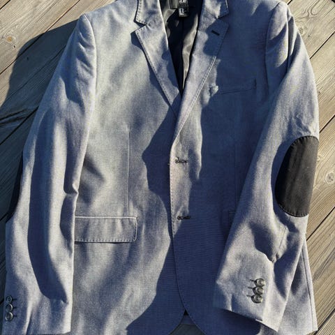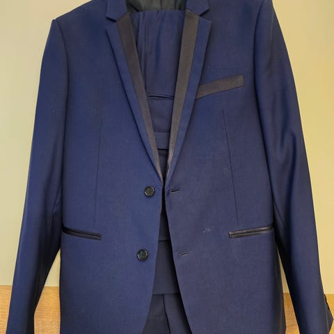 Miesten h&m sininen puku, vuorillinen h&m bleiseri. Kapeat kauluskäänteet. Etupuolella kiinnitys kahdella napilla. Yksi teremallinen rintatasku, läpälliset etutaskut ja sisätasku. Hihansuissa koristenapitus. Koko 54. Samaa sarjaa olevat h&m housut. Koko 54. Molemmat ovat siistejä, olleet kerran käytössä. Nouto tai postitus.