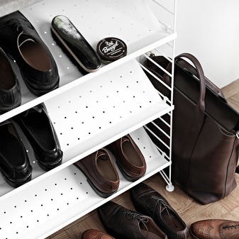 String-kenkähylly on String System -hyllyjärjestelmää täydentävä metallinen hylly, joka kestää hyvin kosteutta. String System -kenkähylly sopii yhteen 30 cm syvien String System- tai String Plex -sivupaneelien kanssa. Hyllylevyssä on pieniä reikiä, ja matala reuna pitää kengät tukevasti paikoillaan.