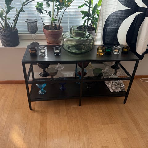 Ikean jo valikoimasta poistunut musta TV-taso, irroitettavilla lasihyllyillä. Pientä käytönjälkeä voi olla muttei mitään suurempaa huomautettavaa.