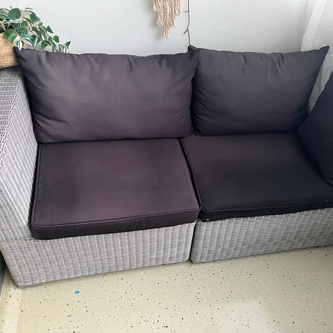 Myydään hyväkuntoinen kaksiosainen polyrottinkinen terassisohva.