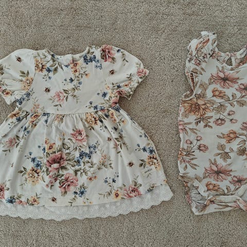 Myydään kaunis Newbie mekko, selässä nepparit, koko 74cm ja Name it sukkahousut takana röyhelö. Molemmat hyvä käytetty kunto.