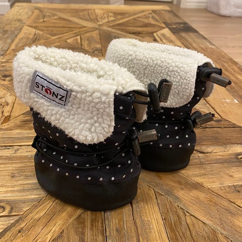 Vähäisen käytön vuoksi todella siistissä kunnossa olevat Stonzit koko S. Harmaat, joissa söpöt viikset. Ainoa mistä näkyy käytön jälkiä on kärjet, pientä pehmentymää. Pohja "vanhempaa" mallia, joka meidän mielestä se parempi pohja ja nimenomaan lapsellekin paljon mukavampi. Pukeminenkin paljon mukavampaa tällä pohjalla.