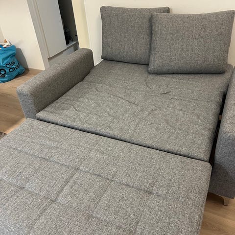 Sohva on jämäkkä puurunkoinen vuodesohva, josta löytyy myös vuodevaatelaatikko.