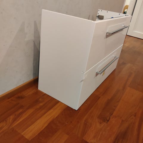 Yksittäinen laatikosto, valkoinen vetimetön laatikosto kolmella laatikolla ja pyörillä.