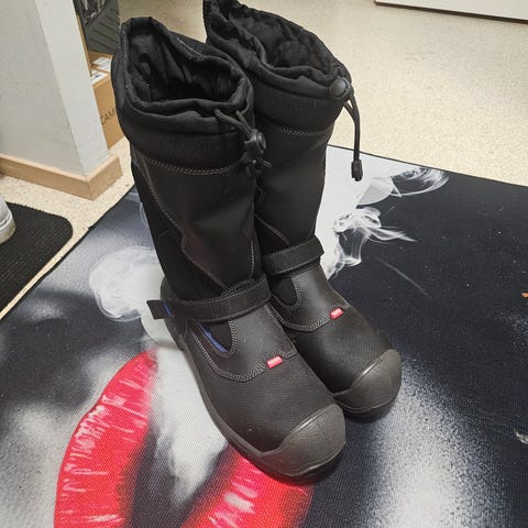 Käyttämättömät naudannahkaiset lämpimät talvikengät nyöreillä ja sivusta vedettävillä vetoketjuilla, jotka helpottaa kengät laittamisen jalkaan. Sisällä lämmin musta karvavuori ja pohjassa irrotettavat Jalaksen omattukevat pohjalliset. Koko 45.