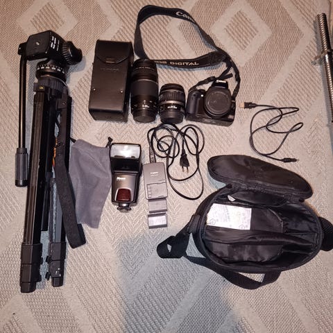 Esimerkiksi kuvien mukainen Canon EOS 500D kamera ja kaksi objektiivia 150€.