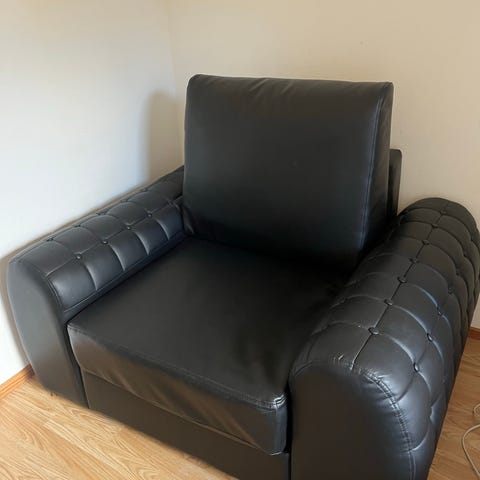 Upea, leveä lounge nojatuoli. Tilaustyönä tehty. Ostettu torista. Pois nyt remontin alta.