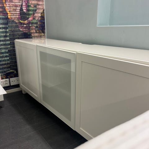 Tumma Ikea Bestå tv taso jossa musta kiiltävä lasitaso. 180x42x40