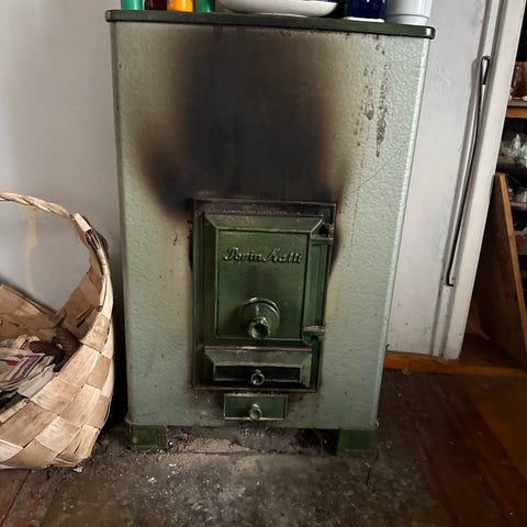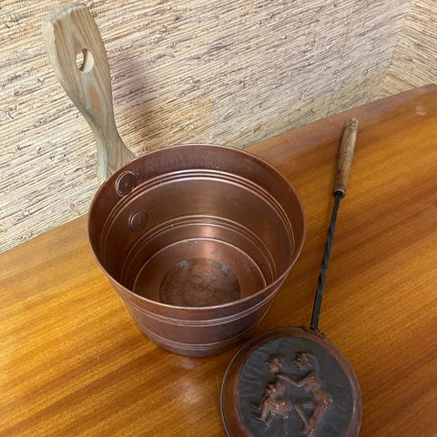 Metallinen puuhella, jossa savupiippu ja luukku. Kuparinen vesisäiliö, jossa hana ja jalat. Käytetty laitteisto, soveltuu lämmitykseen ja veden kuumentamiseen. Materiaalina metalli ja kupari.