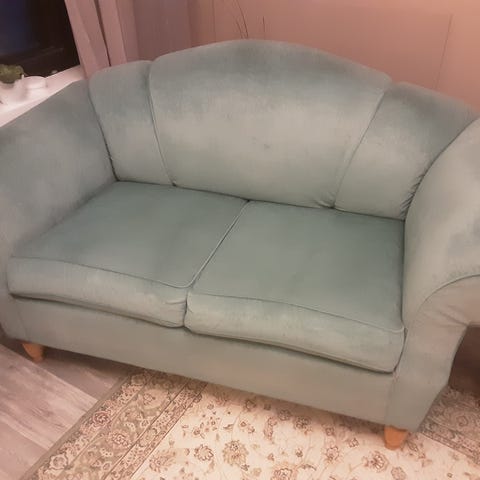 Harmaa kangasverhoiltu 2 istuttava sohva, jossa on metalliset jalat. Kangas on harmaasävyinen ja kuvioitu, jalat ovat pyöreät ja metalliset. Hyväkuntoinen jämäkkä sohva. Eläintalous. Vain nouto.
