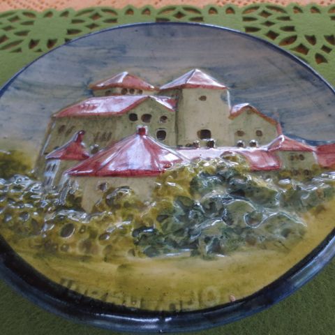 Kupittaan Saven virheetön seinälautanen, läpimitta 16,5 cm, ripustus. Laila Zink, signeerattu.