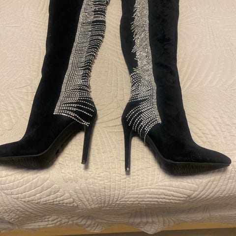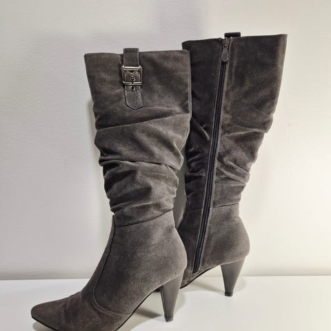 Mustat korkosaappat, varsi yltää noin puoleen väliin pohjetta. Koko 36, sisämitta noin ehkä 25cm. Toisen saappaan sisäpuolella yläreunasta lähtenyt hieman keinonahkaa parista kohtaa. Jalka osa ”nahkaa” ja varsi mokkaa.