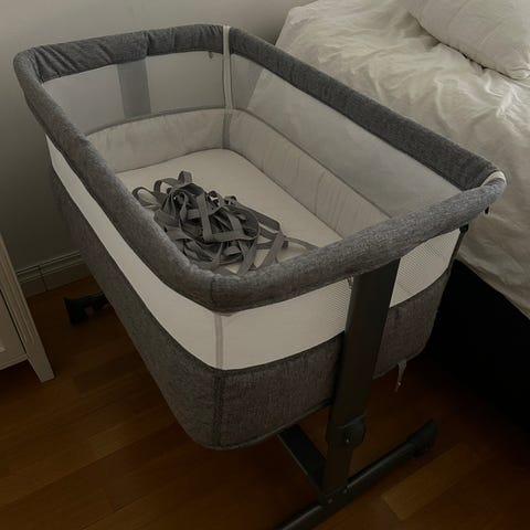 Erittäin siistikuntoinen Emma ensisänky. Toinen reuna avautuu ja sen saa kytkettyä vanhemman sänkyyn kiinni. Jalaksien kärjissä on monta eri toimintoa, joiden avulla sänkyä voidaan liikutella paikasta toiseen sekä keinuttaa vauvaa sängyssä. Toisen päädyn korkeutta voidaan säätää, tehden nuhaiselle vauvalle helpomman nukkuma-asennon.