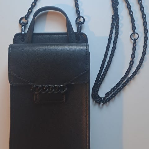 Isompi kokoinen käsilaukku. Korkeus 40cm ja leveys 47cm. Sisällä seinässä kolme pientä taskua, yhdessä vetoketju. Pientä kulumaa, kuva.