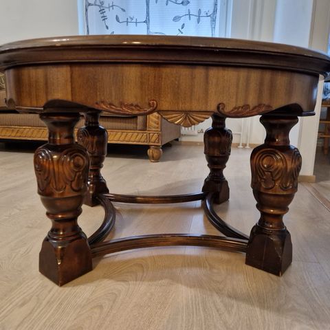 N.30 vuotta vanha olohuoneen pöytä. Elämisen tuomia kulumisen jälkiä pinnassa ja jalassa pieniä kolhuja muuten hyvässä kunnossa. Materiaali täys puutaa joten painaa jonkin verran.