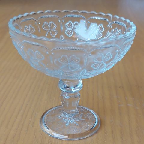 Hyväkuntoinen kirkas, jalallinen jälkiruokamalja tai sokerikko, todellista 80-luvun nostalgiaa! Maljan sisäpuolen pohjassa teksti Nuutajärvi 1893/1977.