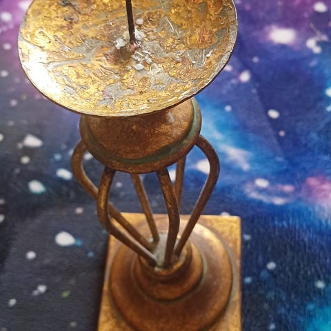 Vanha korkea kynttilänjalka. Puuta, maalattu punaiseksi. Maali hieman lohkeillut, korostaa vanhaa olemusta. Korkeus 63,5 cm.