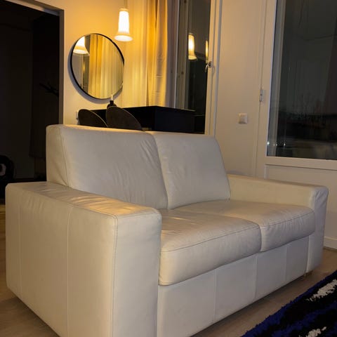 2-istuttava musta nahkasohva. Sohvassa on pehmustetut käsinojat ja selkänoja, sopii olohuoneen kalusteeksi. Sohva on hyvässä kunnossa käytetty alle vuoden