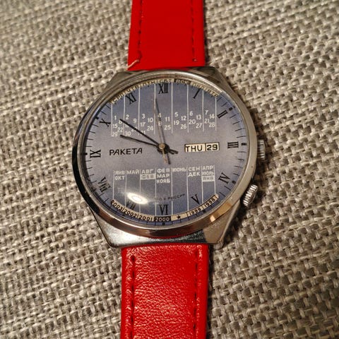 -Todella hienokuntoinen mekaaninen vedettävä Raketa.Kone käy terveellä käynnillä,Pomminlujaa tekniikkaa itänaapurista. Epäilen valmistuksen oleva Ukraina??.Koko ilman nuppia 42mm.Katso kaikki kuvat ja myös kello ranteessa.Ikä?? voi olla 70-80 luvulta. Keräilijän jäämistöä. Katso myös muut myyntini Torissa