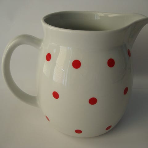 Kuvan Arabia Ping Pong punapallollinen kannu. Korkeus 15cm. Vetoisuus reilu 1,5l.