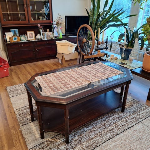 Käytetty lasinen sohvapöytä. Pinnassa naarmuja jotka näkyy valoa vasten katsoessa. Vaikka ensiasuntoon.