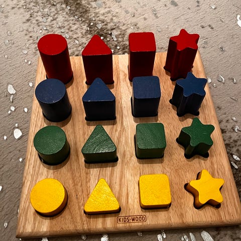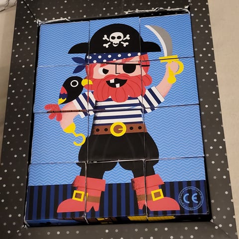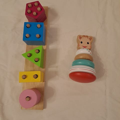 Käytetyt, nätit ja värikkäät Janod puupalikat ja pussi.