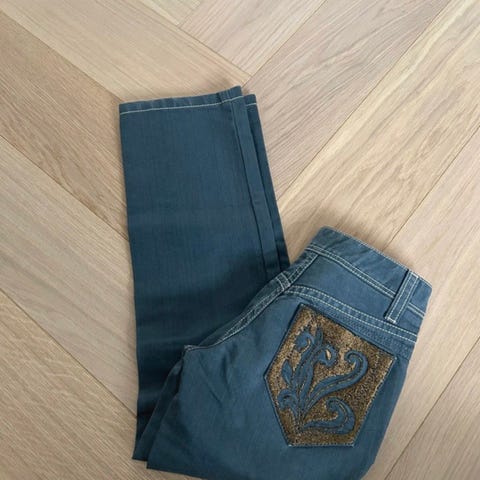 vyötärö 74 cm, pituus 98 cm, sisälahje 71cm, lahkeen leveys lonkan alueella on 30 cm, alhaalla lahkeen leveys 18 cm.