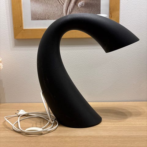 Eero Aarnio valkoinen Swan pöytävalaisin. Valaisin on muotoiltu kaarevaksi ja sopii sisätilojen valaistukseen. Lamput ovat virheettömässä kunnossa. Materiaali on muovia. Korkeus 44 cm, leveys 44 cm.