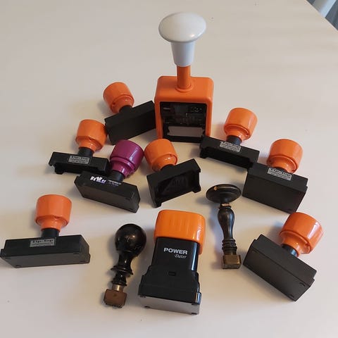 Kaksi leimasinta, toinen varrellinen tekstillä 'MIKKELI' ja toinen metallinen, jossa teksti 'MIKKELIN LÄÄNIN MAAKUNTARAHASTO'.
