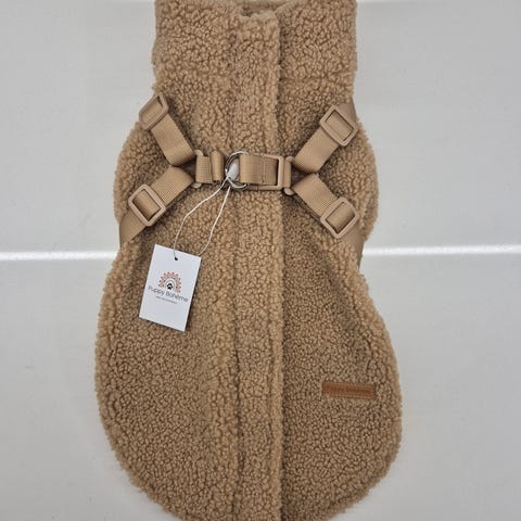 Puppy Boheme koiran teddytakki, jossa valjaat valmiina. Todella helppo käyttää valjaiden ansiosta, ja mukavan pehmeä sisältä sekä ulkoa.