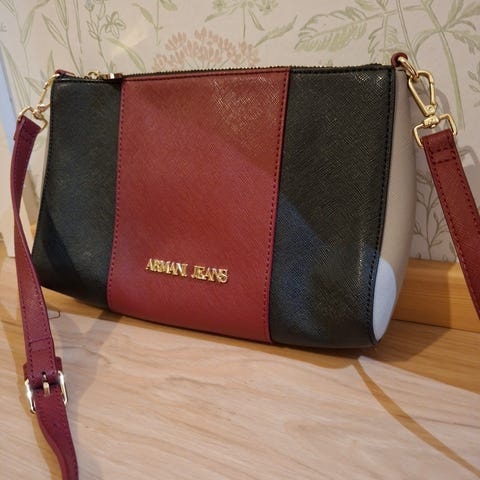 Armani Jeans tekonahkainen olkalaukku. Säädettävä olkahihna. Väriyhdistelmä sininen, musta, valkoinen.
