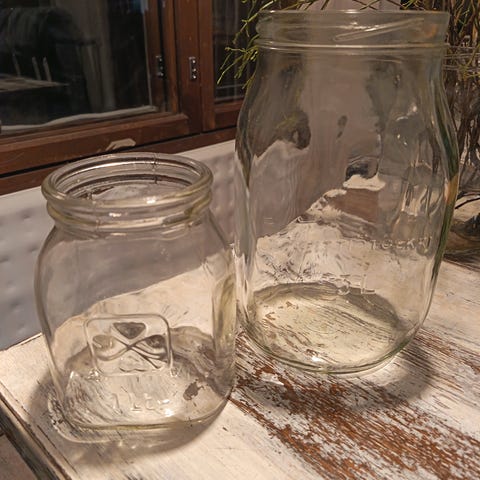 Vanhat antiikki lasitölkit koristeeksi. Ei kansia. Hinta kaikista yhteensä.